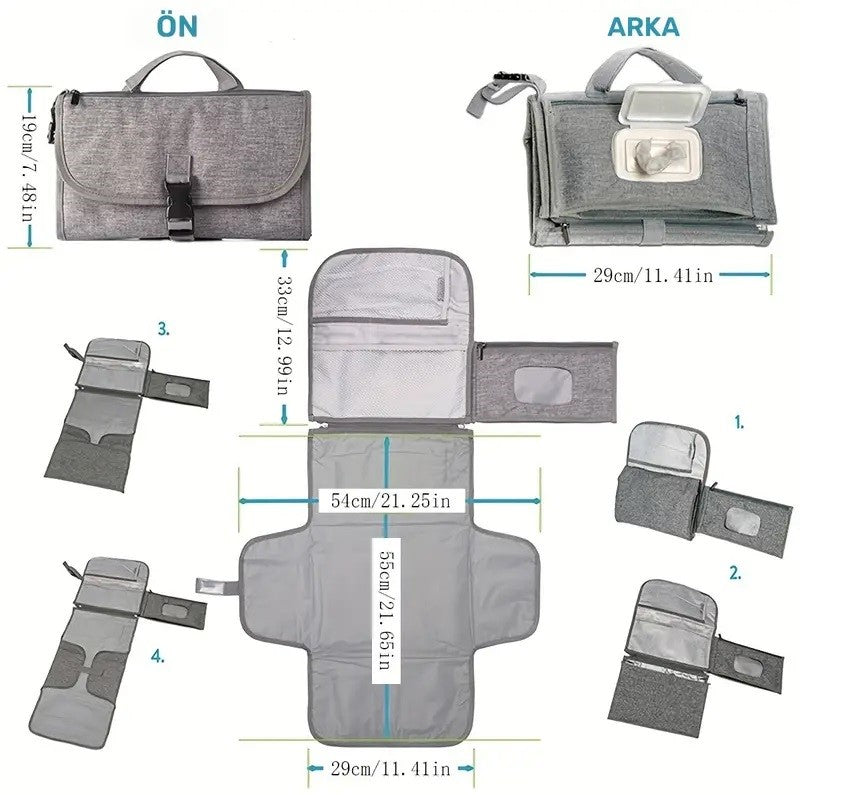 Bu taşınabilir bebek alt açma çantası, şık tasarımı ve fonksiyonel bölmeleriyle annelerin ve babaların vazgeçilmezi. Katlanabilir yapısı sayesinde kolayca çantaya sığar, su geçirmez yüzeyi ile güvenle kullanılabilir.